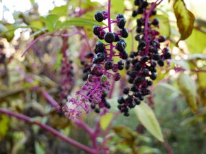 Immer beeindruckend – die Färberpflanze Phytolacca americana, Kermesbeere (früher zum Färben von Rotwein verwendet):
