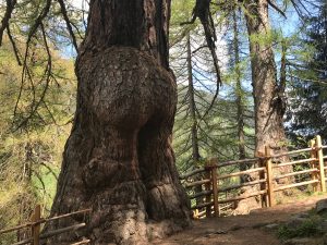 Sie blieben im Lauf ihres langen Baumlebens nicht ganz intakt. Blitzschlag traf ihre Wipfel, aber Äste trieben weiter aus. Ein Baum wird durch Seile gestützt, der Stamm einer der Lärchen ist ausgehöhlt, er wurde ausgemauert.