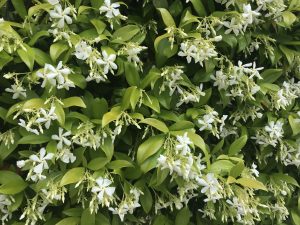 Der Sternjasmin, Trachelospermum jasminoides, stammt ursprünglich aus Asien und ist in Europa als Zierpflanze in warmen Gegenden mit milden Wintern zu finden. Er ist nicht winterhart.